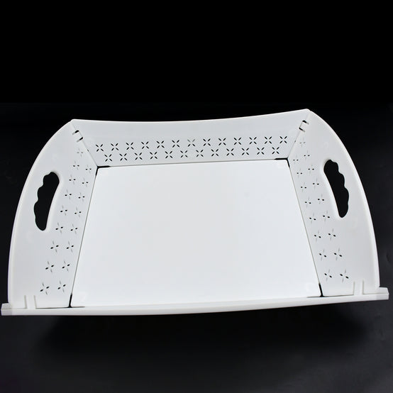 A foldable serving tray is a versatile piece of kitchenware or serving accessory that can be folded for easy storage when not in use. It typically consists of a flat surface supported by collapsible legs or hinges that allow it to be folded into a compact form.