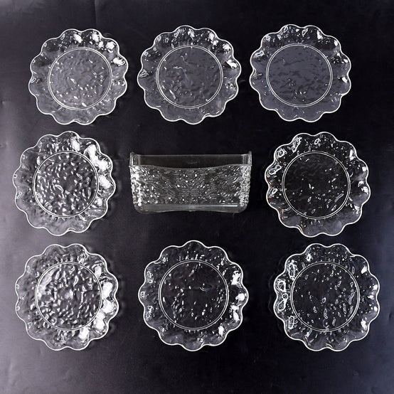 9-Piece Premium Textured Plastic Bowl Set with Serving Tray – Transparent Food-Grade Unbreakable Bowls for Desserts, Salads, Snacks, and Party Serving – Lightweight & Durable in Brown Box Packaging